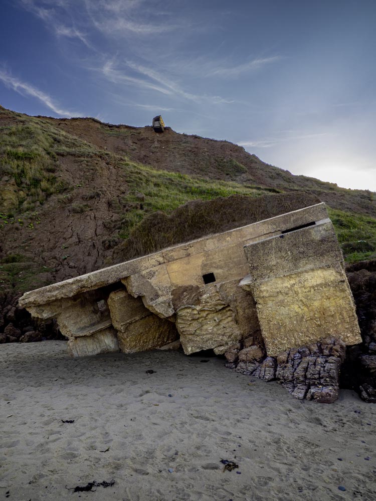 Cayton Bay in North Yorkshire is almost uniquely home to several pill boxes. Some are still on the cliff, some crashed and broken on the sandy beach, and a couple precariously balanced waiting for the last few feet of cliff erosion to send them crashing down. They were built as potential sea defences in WW2, to protect the coast from potential invaders.