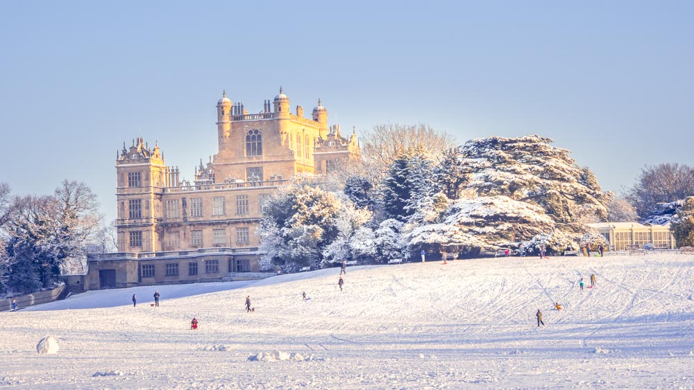 Sounds deadened by soft white snow.